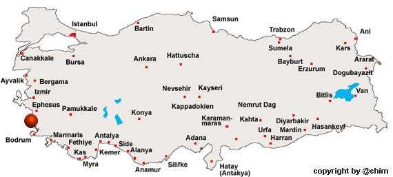 Der direkte Weg nach Didyma (heute Didim) führt von Norden her auf der Nationalstraße D525 über Söke Richtung Milas. 30 km hinter Söke biegen Sie bei der Ortschaft Dalyan nach rechts Richtung Akköy / Didim ab. Nach ca. 22 km über gut ausgebaute Straßen haben Sie die antike Kultstätte erreicht. Von antiken Milet aus erreicht man Didyma, bzw. Didim nach 18 km über die Ortschaft Akköy. Aus Richtung Milas kommend, verlassen Sie die D525 nach 10 km hinter der Ortschaft und biegen links Richtung Altinkum / Didim ab. Von hier sind es gut 70 km nach Didyma. |