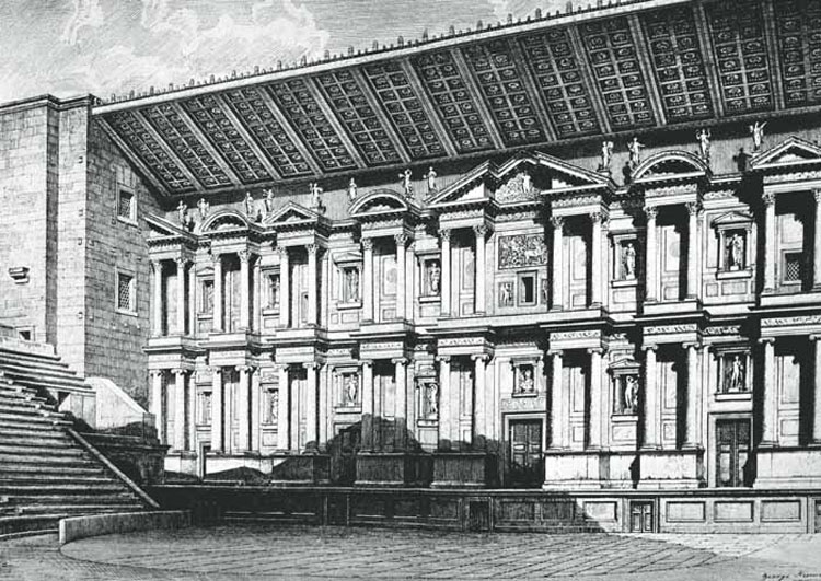 Die Zeichnung (nach Karl Graf Lanckoroński) zeigt die zeichnerische Rekonstruktion der dem Zuschauer zugewandten Seite der Bühnenwand (scaena_frons ). Unterhalb der Mauerkrone sind noch heute die Einlassungen erkennbar, auf denen die hier gezeichnete schräge Holzkonstruktion ruhte, welche die Bühne überspannte und für eine noch bessere Akustik sorgte. |
