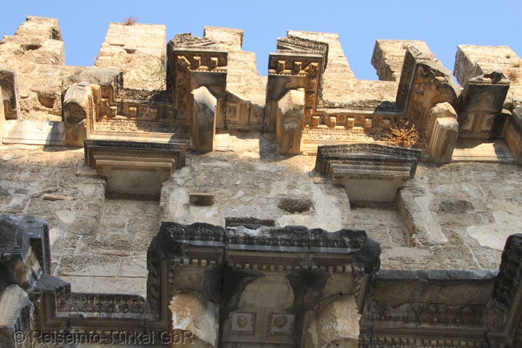 Die Bühnenwand war mit reichhaltigem Säulenschmuck, Balkenwerk, Friesen, Rosetten und Ornamenten verziert. |