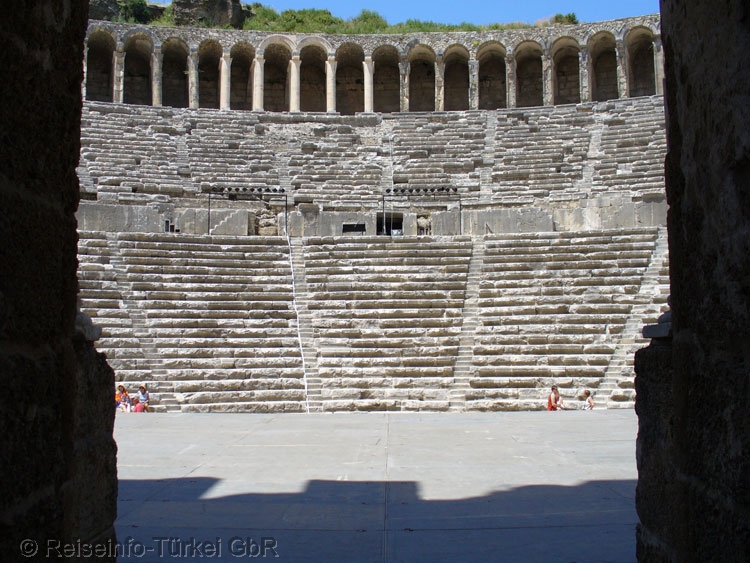 Dieser Blick eröffnet sich dem heutigen Besucher des Theaters, wenn er durch die Porta Regia, dem mittleren Zugang des Bühnenhauses, auf die Orchestra tritt. |