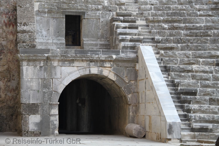 Über den seitlichen Zugängen zum Zuschauerraum ( Parodoi ) befinden sich in Aspendos die Tribunalia, Logen für hervorgehobene Persönlichkeiten, Würdenträger usw. Diese Logen verfügen über einen eigenen Zugang. |