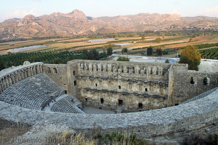 Von der Akropolis hat man einen einzigartigen Blick auf und in das Theater. Eindrucksvoll zeigt sich von hier der außerordentlich gute Erhaltungszustand dieses 1800 Jahre alten Bauwerks. |