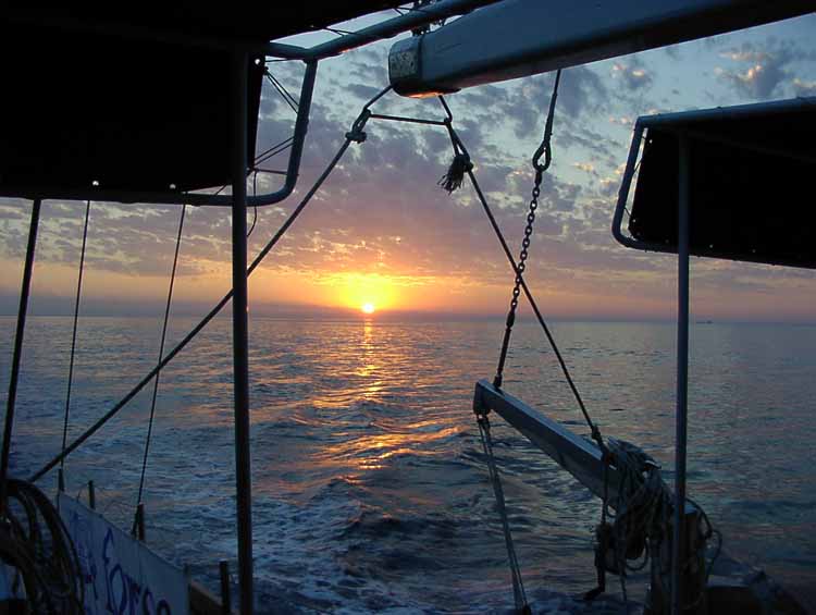 Die Tage neigen sich mit wunderschönen Sonnenuntergängen dem Ende zu. Rechtzeitig vor Sonnenuntergang -zum Abendessen- wird eine der unzähligen Buchten angelaufen, von denen der Kapitän weiß, dass hier keine Mückenschwärme einen entspannten Abend an Bord stören werden. |
