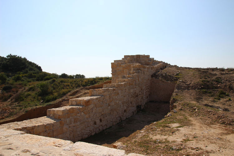 Das Foto zeigt die (teil)rekonstruierte Stadtmauer auf der linken Seite des Bouleuterions. Die Tiefe der Ausgrabungen lässt erahnen, bis zu welcher Höhe der Flugsand der Dünen große Teile der Stadt und das Bouleuterion bedeckt hatte. |