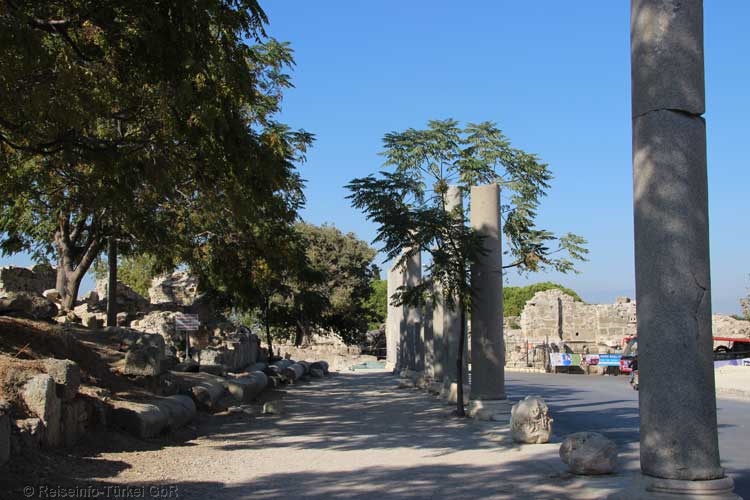 Vom Triumpfbogen verlief eine repräsentative, von Säulengängen flankierte Hautstraße quer über die Halbinsel bis zur Südspitze, zu den Tempeln der Athena und des Apollon. Erhalten ist von dieser Straße lediglich ein kläglicher, 100 Meter langer Rest im Bereich des Theaters. Einst befanden sich Geschäfte und öffentliche Einrichtungen am Rand der überdachten Säulengänge. Heute befindet sich gegenüber dem Theater (links) ein bewachter Parkplatz. |