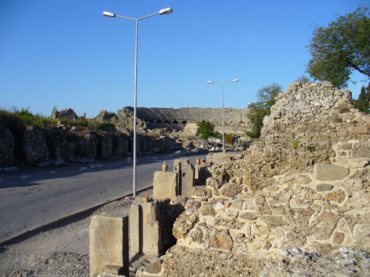 Das antike Theater von Side wurde in der Mitte des 2. Jh. n. Chr. in den heute sichtbaren Ausbauzustand versetzt. Etwa ein Jahrhundert später wurde die orchestra für Arenakämpfe umgebaut. Das Theater wurde auf dem Übergang zur Landzunge errichtet. In Ermangelung eines Hügels wurde eine Doppelbogen-Galerie mit umlaufendem Korridor erstellt. Auf den Umgang (Diazoma) zwischen dem ersten und zweiten Rang münden 23 Gewölbedurchgänge. |