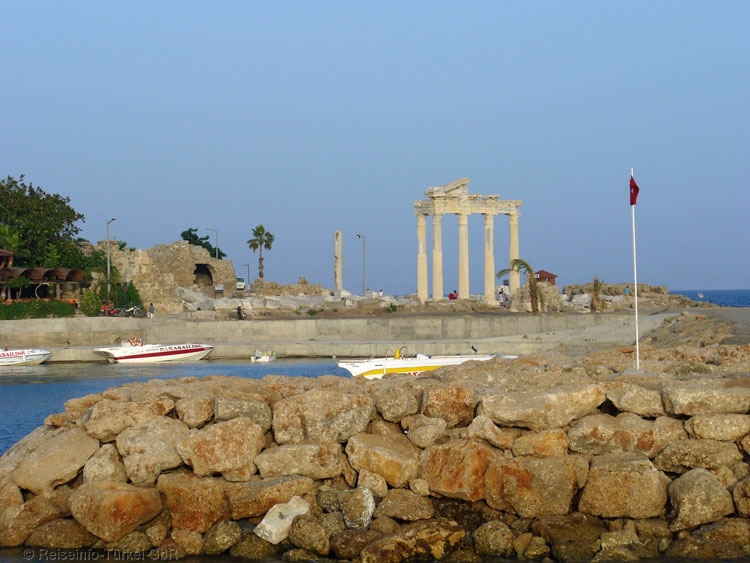 An der Südspitze der Halbinsel befanden sich, schon von weit her sichtbar, die strahlend weißen Tempel der Liebesgöttin Aphrodite und des Sonnengottes Apollon. Vom Apollon-Tempel am Hafen wurden fünf Säulen wieder aufgerichtet und bilden aufgrund der exponierten Lage ein beliebtes Foto-Motiv. |