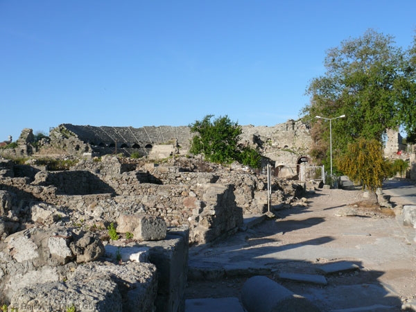 50 Meter vor der Agora, gegenüber dem Museum befindet sich ein besonderes Gebäude an der Kolonnadenstraße. Es enthält ein wannenähnliches Becken und reliefartige Verzierungen die männliche und weibliche Geschlechtsorgane darstellen. Der Brunnen in diesem Haus ist in der Form weiblicher Organe angelegt. Daraus schließen die Archäologen, dass es sich um ein Freudenhaus handeln muss. In einer Ecke des Hauses wurde in späterer Zeit eine Latrine (öffentliche Toilette) eingerichtet. |