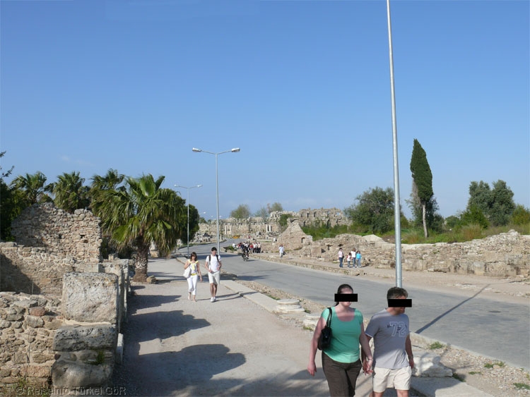 Geht man die Kolonnadenstraße vom Theater stadtauswärts, Richtung Haupttor, sieht man schon von Weitem das Nymphäum aus römischer Glanzzeit. Das mehrstöckige Gebäude lag vor dem Haupttor, außerhalb der äußeren Stadtmauer. 50 Meter vor dem Stadttor zweigt eine erst in den letzten Jahren ausgegrabene Säulenstraße (auf dem Foto rechts) von der Kolonnadenstraße ab. |