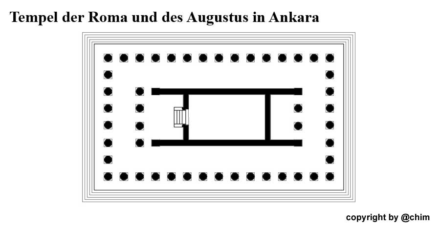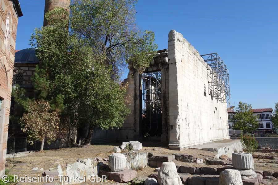 Das Gebäude wurde ursprünglich im 2. Jahrhundert v. Chr. als Tempel der phrygischen Gottheiten Men und Kybele errichtet. Nachdem Ancyra 25 v. Chr. zur Hauptstadt der römischen Provinz Galatien wurde, wurde der Tempel umgebaut und dem Kult der römischen Stadtgöttin Roma und des vergöttlichten Augustus geweiht. Auf der erhaltenen südöstlichen Innenwand des Pronaos ist die lateinische Version einer Inschrift zu lesen, die griechische Version befindet sich auf der südöstlichen Außenwand der Cella. Die Buchstaben des Dokuments waren ursprünglich farbig gestaltet. |