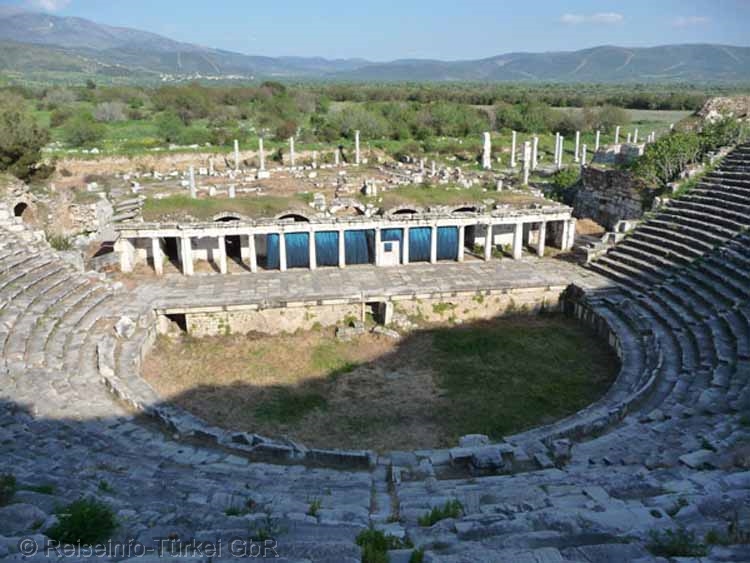 Das (griechische) Theater von Aphrodisias wurde im 1. Jh. v. Chr. errichtet und vermutlich 35 v. Chr. geweiht. Es schmiegt sich an den Westhang des Akropolis-Hügels. Das Theater wurde in römischer Zeit mehrfach umgebaut. Der heutige Zustand entspricht dem Ausbau des 2. bis 3. Jh. n. Chr. Die orchestra wurde unter Marc Aurel (römischer Kaiser von 161-180 n. Chr.) vertieft und für Gladiatoren- und Tierkämpfe umgebaut. Zur Reinigung konnte die orchestra geflutet werden. Unter seinem Vorgänger, Antoninus Pius (138-161 n. Chr.), wurde die summa cavea, die oberen Zuschauerränge, für das niedere Volk, erweitert. Freigelegt wurde das Theater in den 70er Jahren des letzten Jahrhunderts durch die New York University. |