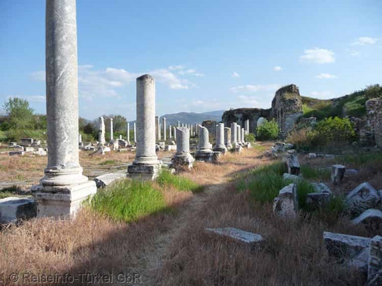 Sie erreichen Aphrodisias über die Nationalstraße D585. Von Norden (Izmir, Kusadasι, Selçuk) kommend, fahren Sie am schnellsten über die Autobahn bis Aydιn, dann weiter auf der D320, Richtung Denιzlι. 4 km nach dem Dorf Kuyucak zweigt rechts die nach Karacasu und Aphrodisias ausgeschilderte Straße ab, die Sie nach knapp 38 km direkt nach Aphrodisias führt. Aus Richtung Marmaris fahren Sie zuerst auf der Nationalstraße D550 nach Muğla, weiter auf der D330 Richtung Denιzlι. Am Ortseingang von Tavas zweigt links die ausgeschilderte Straße Richtung Karacasu ab. Nach ca. 35 km erreichen Sie Aphrodisias. Von Antalya kommend fahren Sie auf der D350 über Korkuteli bis Söğüt. Dort biegen Sie rechts ab auf die D585 / E87, Richtung Denιzlι. Nach ca. 95 km biegen Sie nach links auf die D330, Richtung Muğla / Tavas ab. Am Ortsausgang von Tavas zweigt rechts die Straße Richtung Karacasu ab. Nach ca. 35 km haben Sie Aphrodisias erreicht. |