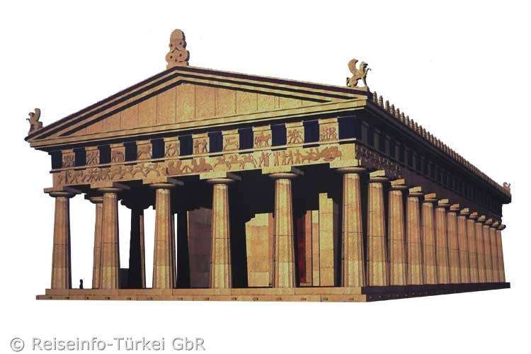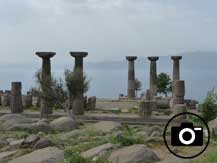Um 530-520 v. Chr. wurde an der höchsten Stelle der Tempel der Athena errichtet. Einige der Säulen aus einheimischem Trachyt, die jedoch im Altertum mit weißem Marmorstuck überzogen waren, wurden im Rahmen der archäologischen Forschungen teilweise wieder aufgestellt. Der Athena-Tempel ist der einzige bekannte archaische Tempel dorischer Ordnung in Kleinasien. Von hier hat man einen guten Blick auf die gegenüberliegende Insel Lesbos. |