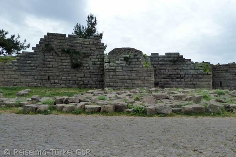 Die Stadtmauer ist in ihrer Ausdehnung von 3 km mit Türmen und Toren in großen Teilen noch sehr gut erhalten. Sie entstand in vielen Bauphasen vom 3. Jahrhundert v. Chr. bis in byzantinische Zeit. Daneben sind Reste einer wohl noch älteren Stadtmauer sichtbar. |