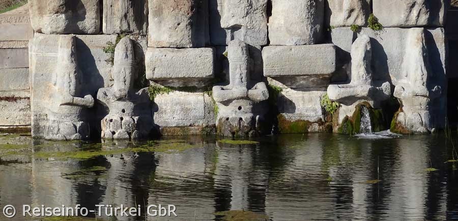 Eflatun Pınar (türkisch für Platons Quelle oder Lila Quelle), auch Eflatunpınar, ist ein hethitisches Quellheiligtum. Eine 7 Meter breite und 4,2 Meter hohe Fassade aus plastisch gestalteten Steinblöcken erhebt sich an der Nordseite eines gestauten Quellteichs, dessen gemauerter Rand eine annähernd quadratische Wasserfläche von 30 × 34 Metern umschließt. |