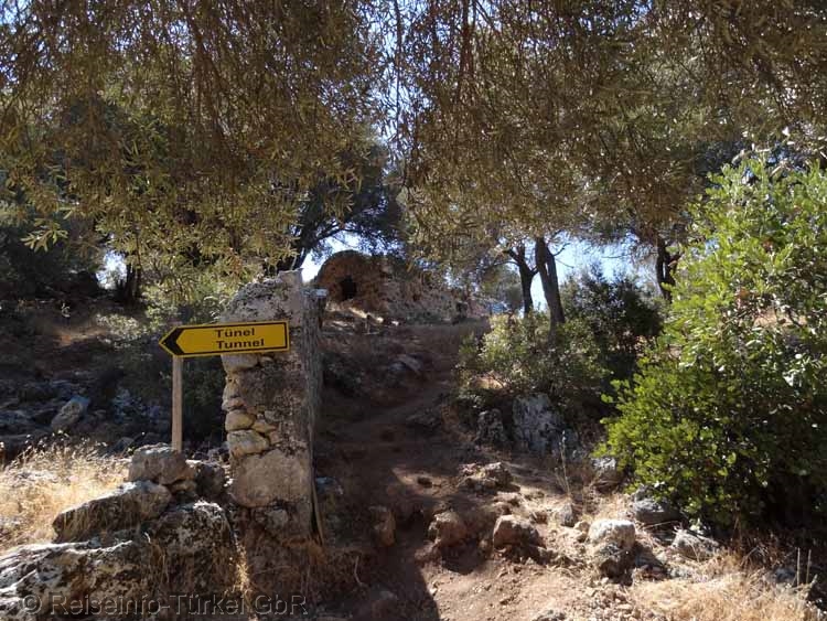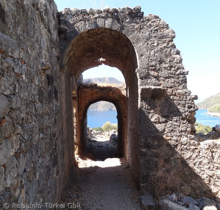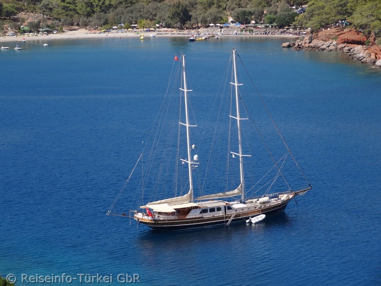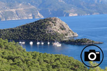 Man erreicht die Insel von Fethiye aus. Folgen Sie der Ausschilderung nach Ölüdeniz. Nach 5 km bergauf, in Ovacik, den nächsten Ort, fahren Sie die untere Straße, die Atatürk Cad., durch den Ort und folgen der Beschilderung nach Kayaköy. Dort richten Sie sich nach der Beschilderung Gemiler Adasi/Af Kule. Ca. 7 km nach Kayaköy erreichen Sie die Gemiler Bucht. Hier müssen Sie den kostenpflichtigen Parkplatz benutzen. In der Bucht (siehe Foto oben) stehen kleine Boote für den privaten Fährdienst zur Verfügung. Nicht wenige Besucher der Insel erreichen sie mit einem Segelboot oder im Rahmen einer Blauen Reise auf einer Gulet. |