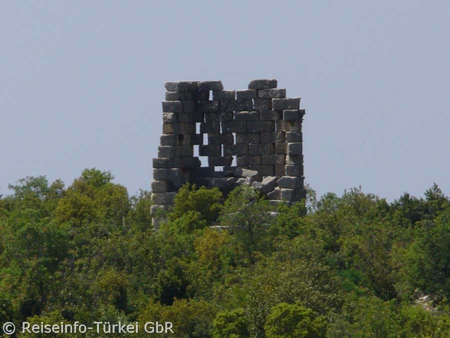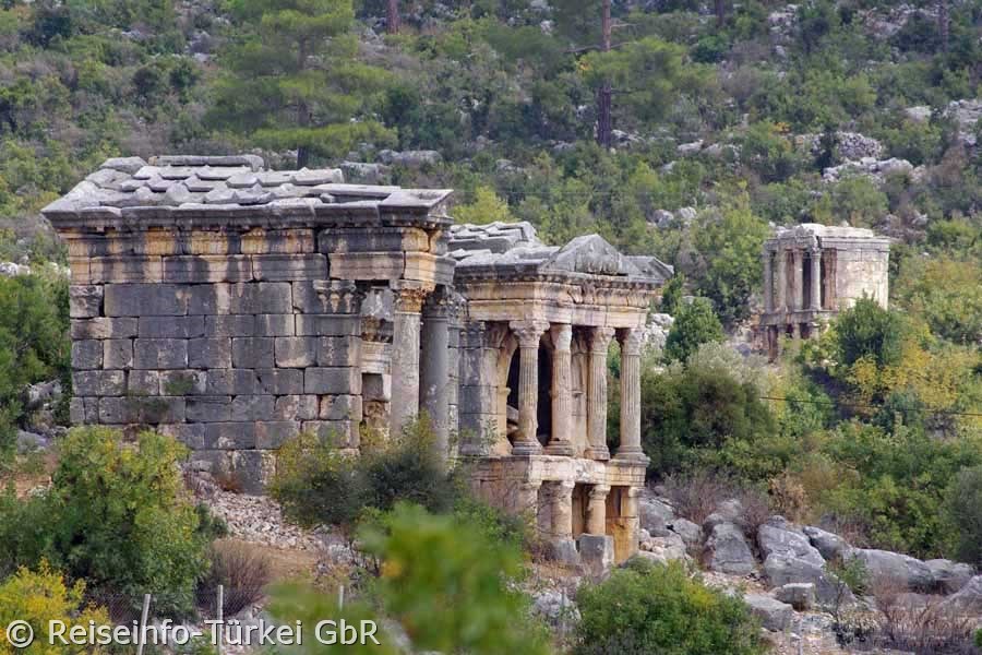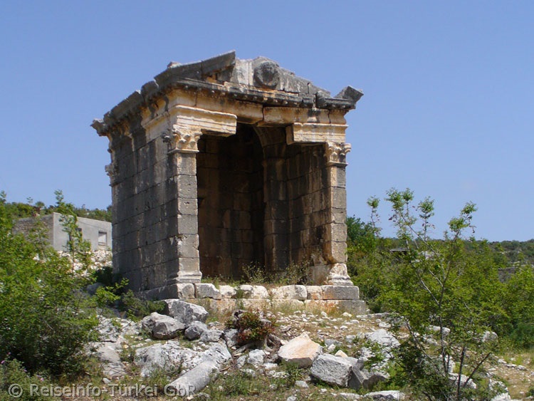 Auf die Straße nach Silifke zurückgekehrt, trifft man an der scharfen Kurve nach dem Ort auf das "untere" Tempelgrab. Es ist nach Süden ausgerichtet und misst 5,3 x 4,25 m und ist 6,25 m hoch. Das Grab ist ebenfalls in die Gründerzeit des Ortes, also in das 2. Jh. n. Chr. zu datieren. | |||