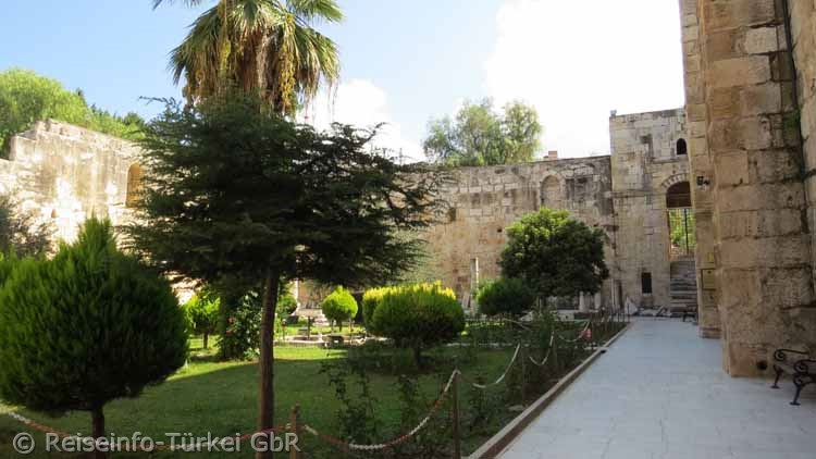 Über dem Portal steht das einzig verbliebene Minarett, das zweite befand sich über dem gegenüberliegenden, bergseitigen Tor. Ein drittes, kleineres Tor liegt an der Nordseite. Im Zentrum des Hofes befindet sich ein achteckiger Brunnen. |