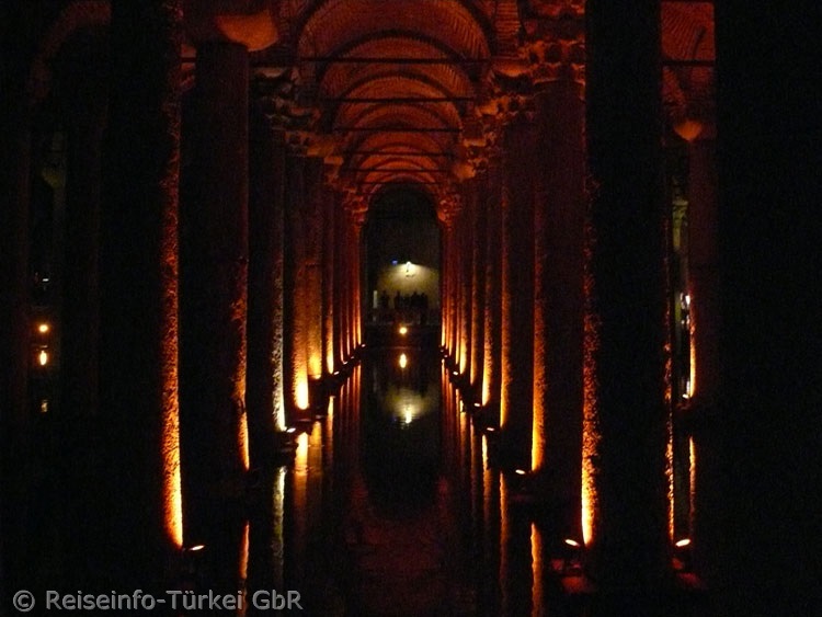 Die Yerebatan Zisterne (Yerebatan Sarayı) neben der Hagia Sophia wurde unter Kaiser Justinian errichtet. Dieser ließ die Zisterne zwischen 532 und etwa 542 als Wasserspeicher für den Großen Palast angelegen. Darüber befand sich eine große Basilika, daher wird die Zisterne auch cisterna basilica genannt. Sie hat ein Fassungsvermögen von ca. 80.000 Kubikmetern. Zwölf Reihen von 28, insgesamt also 336 jeweils acht Meter hohen Säulen mit überwiegend korinthischen Spolienkapitellen tragen das Gewölbe. Das Wasser, das in bester Qualität aus dem Belgrader Wald im Hochland westlich von Istanbul über die Viadukte des Hadrian und des Valens kam, diente zur Versorgung des kaiserlichen Haushaltes. Die Anlage kann besichtigt werden. Im Wasser der Zisterne sind oftmals etliche, zum Teil sehr helle bis weiße Fische zu beobachten. Im nordwestlichen Teil der Zisterne sind die Reliefs umgekehrter Medusenhäupter zu sehen. Diese sind fehlerhaft und stammen ursprünglich aus den Prokonesos-Steinbrüchen. Die Yerebatan Zisterne ist heute eine beliebte Sehenswürdigkeit. Es werden Lichtspiele inszeniert, über Lautsprecher kommt klassische Musik. |