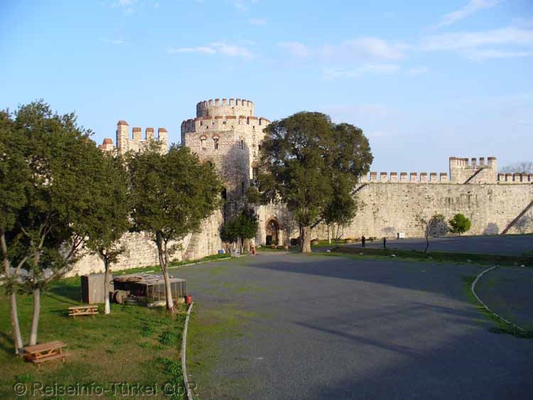 Die Festung Yedi Kule, (türkisch sieben Türme) ist die größte und am besten erhaltene Festung der großen Stadtmauer. Hier am Marmara Meer befand sich das Goldene Tor, dass als Prozessionseingang in die byzantinische Stadt diente. Die Römer und späteren Byzantiner bezeichneten das größte und mehrfach gesicherte Stadttor als Porta Aurea ("Goldenes Tor"), durch das der Kaiser nach gewonnenen Schlachten in die Stadt einzog. |