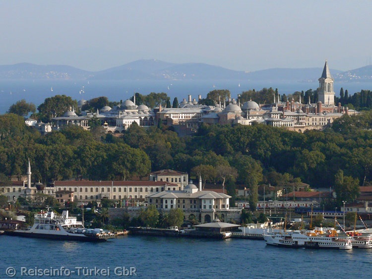 Das Topkapi Sarayı war Jahrhunderte lang der Wohn- und Regierungssitz der Sultane sowie das Verwaltungszentrum des Osmanischen Reiches. Mit dem Bau des Palastes wurde bereits kurz nach der Eroberung Konstantinopels begonnen. Der Palast war mit seiner Größe von über 70 ha eine eigene Stadt. Bis zu 40.000 Menschen lebten in den Räumlichkeiten. Erbaut wurde der Palast auf der Spitze einer Halbinsel. Der Blick vom Palast erlaubt eine unerreichte Panoramaansicht auf Istanbul, den Bosporus und das Goldene Horn. Er ist in vier Höfe unterteilt, die jeweils durch eigene Tore erreicht werden. Seit 1923 ist im Topkapi Saray ein Museum untergebracht. Es beherbergt Sammlungen von Porzellan, Handschriften, Portraits, Gewändern, Juwelen und Waffen aus dem osmanischen Reich, ferner diverse islamische Reliquien, wie Waffen Mohammeds und der ersten Kalifen, eines der ältesten Koranexemplare oder auch Barthaare des Propheten Mohammed. Konservative Muslime fordern deswegen eine Schließung des Palastes für den Tourismus. |