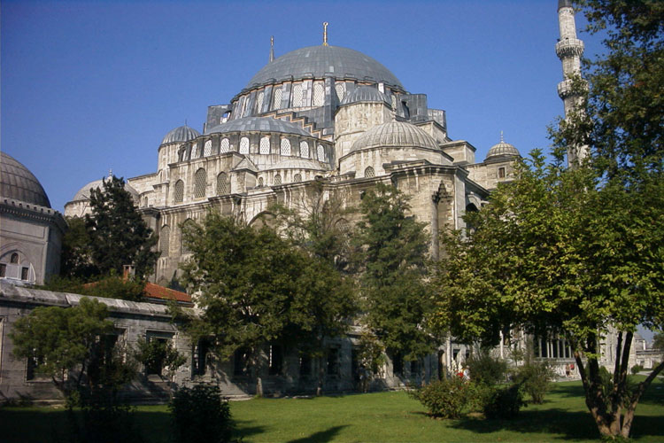 Die Süleymaniye Moschee (Süleymaniye Camii) ist eine der großen Moscheen in Istanbul. Sie wurde im Auftrag von Sultan Süleyman dem Prächtigen in den Jahren 1550 bis 1557 gebaut und ist das Hauptwerk des großen Baumeisters Sinan. Die Moschee hat vier Minarette die andeuten sollen, dass Süleyman der vierte Sultan seit der Eroberung von Konstantinopel war. |