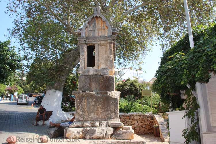 Über den Ort verteilt, finden sich etliche Sarkophage und Felsengräber aus lykischer Zeit. Dieser Sarkophag befindet sich direkt an der Hafeneinfahrt. |