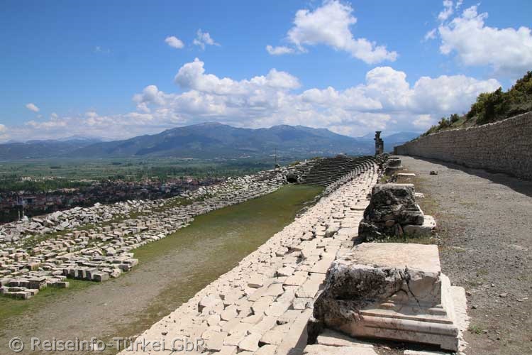 Von der obersten Sitzreihe des Bouleuterions bietet sich ein herrlicher Blick auf das Hinterland und die heutige Ortschaft Gölhisar. In der Ferne ist der Gölhisar Gölü zu sehen. Auf einer Halbinsel lag in 10 km Entfernung von Kibyra die Vorgängersiedlung Kibyriatis. |