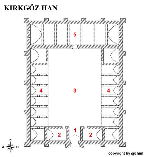 Wie in vielen seldschukischen Karawansereien reihen sich auch im Kirkgöz Han arkadenartig offene Gewölbezellen um einen offenen Innenhof. Allerdings dominiert hier eine geschlossene Halle die Nordseite der Han, an deren rechter und linker Seite sich je eine geschlossene Zelle anschließt. Links und rechts neben dem Eingangsportal befinden sich in der Kirkgöz Han ebenfalls je eine geschlossene Zelle. Die rechte Zelle dürfte, wie in der Kargi Han, als Moschee oder Betraum gedient haben. |