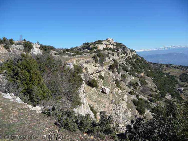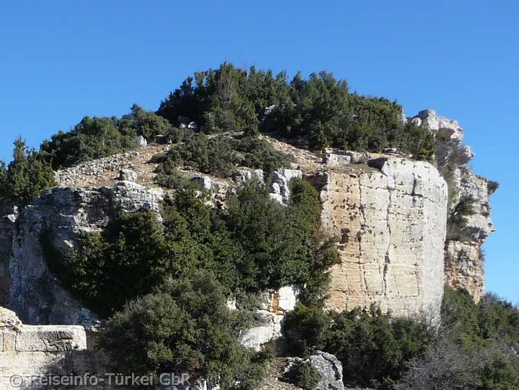 Sie erreichen Kremna über die Nationalstraße D685 von Antalya nach Isparta. Knapp 70 km nach dem Abzweig der D685 von der Küstenstraße D400 nahe dem Flughafen Antalya erreichen Sie linker Hand den deutlich ausgeschilderten Abzweig nach Kremna. Die 10 km über für die Bergregion typische asphaltierte Straße führt teils in steilen Serpentinen zum Dorf Çamlık. Von dort aus folgen Sie 2 km der Beschilderung nach Bucak. An der nächsten Siedlung führt im spitzen Winkel ein unbefestigter Weg rechts ab nach Kremna. Auch dieser Weg ist ausgeschildert. Nach weiteren 600 m erreichen Sie das Wächterhaus. Von Bucak aus fahren Sie Richtung Kocaaliler, dann folgen Sie der Beschilderung nach Çamlık. |