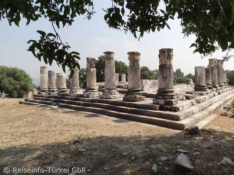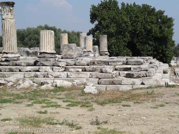 Das Hekate-Heiligtum Lagina liegt nahe dem Ort Turgut, 15 Kilometer nordwestlich der Stadt Yatağan. Biegen Sie von der Nationalstraße D330 Richtung Milas, ca. 2 km nach Ortsende Yatağan am Kraftwerk rechts ab. Nach 7 km erreichen Sie Turgut, an dessen Ortsanfang rechts der Weg zum Heiligtum Lagina braun ausgeschildert ist. Nach gut 500 Meter haben Sie die Ausgrabungsstätte erreicht. |