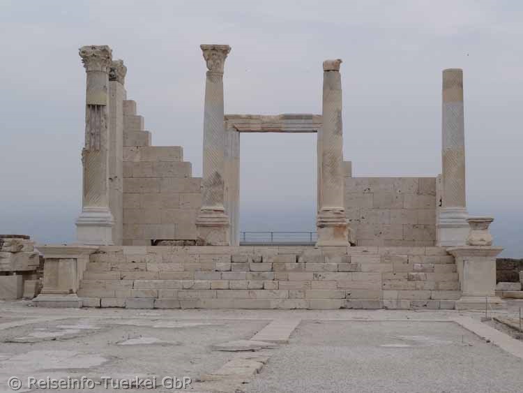 Der Tetrapylon, im Hintergrund die Kalksinterterrassen von Pamukkale | |||