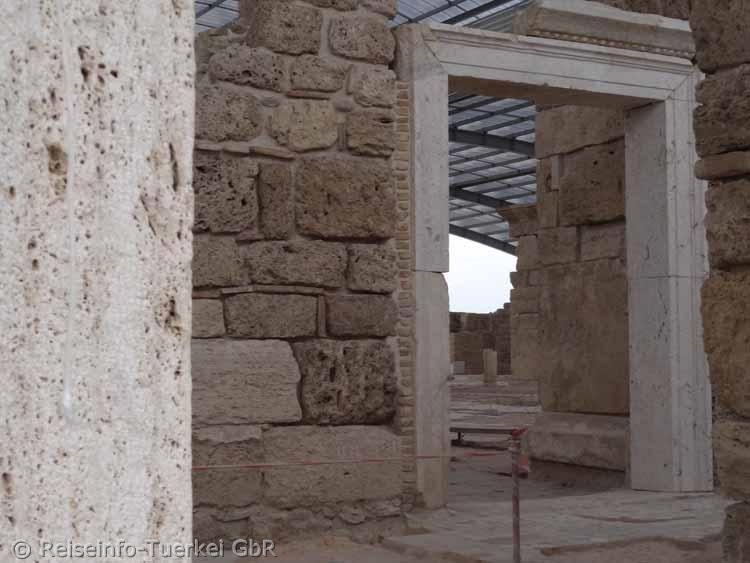 Auf der Nord-Ostseite des Stadions befinden sich die gewaltigen Überreste eines Gymnasions mit großer Badeanlage. Der 133 x 75 Meter große Komplex wurde nach einer Inschrift anlässlich des Besuches von Kaiser Hadrian und seiner Frau Sabina im Jahr 135 n. Chr. errichtet. |