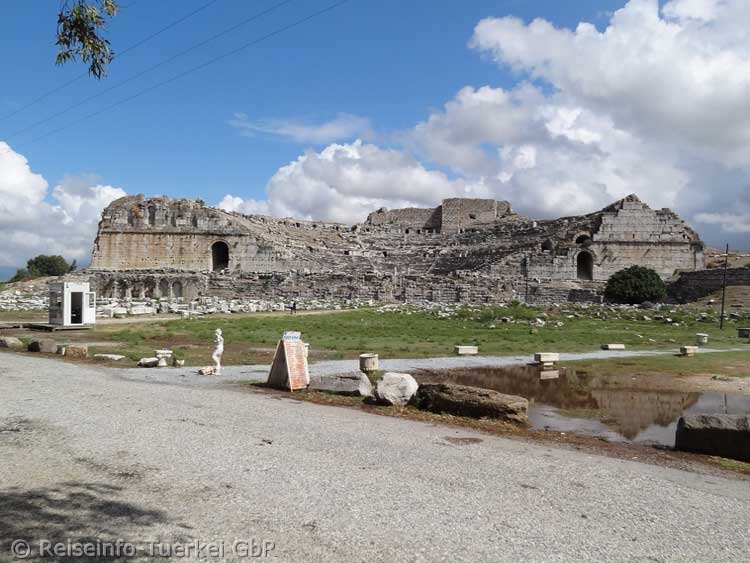 Die beste Zeit Milet zu besichtigen ist der Herbst. Im Frühjahr steht der Grundwasserspiegel wie überall im Schwemmland des großem Mäander sehr hoch, sodass z.B. im Frühjahr Vieles, wie auf den obigen Fotos, unter Wasser steht. Der schnellste Weg nach Milet führt von Norden her auf der Nationalstraße D525 über Söke Richtung Milas. 30 km hinter Söke biegen Sie bei der Ortschaft Dalyan nach rechts Richtung Akköy / Didim ab. In Akköy biegen sie rechts nach Milet ab. Von dort aus sind es noch 5 km. Aus Richtung Milas