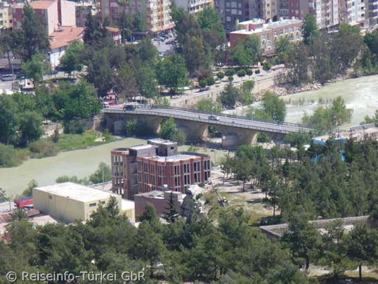 Der Göksu teilt die Stadt in zwei Hälften. Drei Brücken, darunter eine Steinbrücke mit römischen Fundamenten spannen sich über den Fluss, dessen Ufer von Parks und schattigen Teegärten gesäumt sind. |