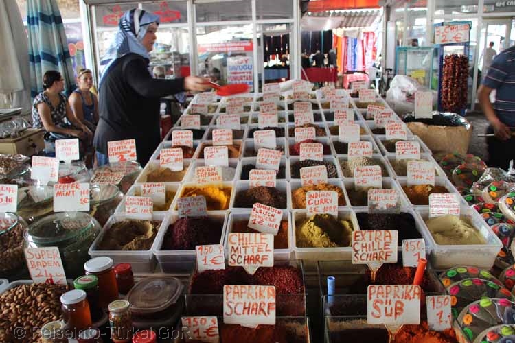 Der große Bazar im Zentrum Manavgats ist gänzlich auf den Tourismus ausgelegt. Das Angebot an preisgünstigen Textilien ist schier unüberschaubar. Schuhe, Taschen, Koffer, Musik-CD´s; alles was man als Tourist gebrauchen könnte ist dort zu finden. Und ... es darf gehandelt werden, ja ist genau betrachtet unumgänglich. |