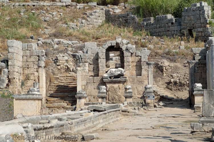 Über dem Brunnen thronte eine Statue des Flussgottes Kestros. Vom Nymphäum führte in der Mitte der Kolonnadenstraße ein offener Kanal Wasser in Kaskaden bis zu einer Therme am Stadttor und vermutlich noch weiter. |