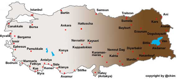 Die dünn besiedelte anatolische Hochebene ist eine herbe, teilweise steppenähnliche Landschaft die kontinuierlich nach Osten bis auf 2000 m ansteigt. Die dort lebenden Menschen sind extremen Lebensbedingungen ausgesetzt. Diese konnten die Hethiter, Assyrer, die Urartäer, später Griechen und Römer, Seldschuken und osmanische Türken aber nicht davon abhalten, hier zu siedeln. In Zentral- und Ostanatolien erlebt man teilweise sehr heiße Sommer mit Temperaturen um die 40 Grad Celsius im Schatten und bitterkalte Winter mit -30 Grad Celsius und darunter. Der Schnee bleibt in manchen Regionen über Monate liegen. |