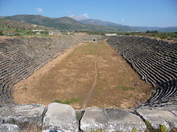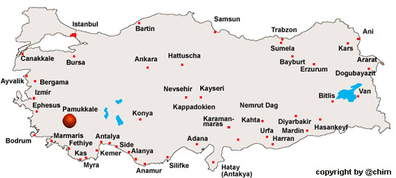 Sie erreichen Aphrodisias über die Nationalstraße D585. Von Norden (Izmir, Kusadasι, Selçuk) kommend, fahren Sie am schnellsten über die Autobahn bis Aydιn, dann weiter auf der D320, Richtung Denιzlι. 4 km nach dem Dorf Kuyucak zweigt rechts die nach Karacasu und Aphrodisias ausgeschilderte Straße ab, die Sie nach knapp 38 km direkt nach Aphrodisias führt. Aus Richtung Marmaris fahren Sie zuerst auf der Nationalstraße D550 nach Muğla, weiter auf der D330 Richtung Denιzlι. Am Ortseingang von Tavas zweigt links die ausgeschilderte Straße Richtung Karacasu ab. Nach ca. 35 km erreichen Sie Aphrodisias. Von Antalya kommend fahren Sie auf der D350 über Korkuteli bis Söğüt. Dort biegen Sie rechts ab auf die D585 / E87, Richtung Denιzlι. Nach ca. 95 km biegen Sie nach links auf die D330, Richtung Muğla / Tavas ab. Am Ortsausgang von Tavas zweigt rechts die Straße Richtung Karacasu ab. Nach ca. 35 km haben Sie Aphrodisias erreicht. |