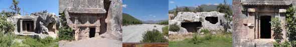 liegt in der Nähe der heutigen Ortschaft Ören. Die Straße führt schnurgerade in die Ortschaft Kemer. In Kemer halten Sie sich links, überqueren die Brücke über den Fluß Koca Çayı und biegen gleich nach der Brücke nach rechts, Richtung Ortaköy ab. Nach gut 12 km erreichen Sie Ortaköy. Durchqueren Sie die Ortschaft und folgen sie der Ausschilderung nach Ören. Nachdem Sie den durch das aus dem Gebirge mitgerissene Geröll zu beachtlicher Breite ausgewaschenen Koca Çayı erneut überquert haben, erreichen Sie nach weiteren 2,5 km die direkt an der Straße liegenden Felsengräber von Araxa. |