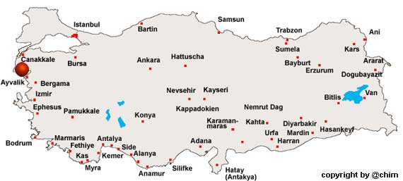 Die Stadtmauer ist in ihrer Ausdehnung von 3 km mit Türmen und Toren in großen Teilen noch sehr gut erhalten. Sie entstand in vielen Bauphasen vom 3. Jahrhundert v. Chr. bis in byzantinische Zeit. Daneben sind Reste einer wohl noch archaischen Stadtmauer sichtbar. Der dorische Tempel der Athena an der höchsten Stelle des Stadtberges wurde um 530–520 v. Chr. errichtet. Einige der Säulen aus einheimischem Trachyt, die jedoch im Altertum mit weißem Marmorstuck überzogen waren, wurden im Rahmen der archäologischen Forschungen teilweise wieder aufgestellt. Der Athenatempel ist der einzige bekannte archaische Tempel dorischer Ordnung in Kleinasien. Von hier hat man einen guten Blick auf die gegenüberliegende Insel Lesbos. Im Stadtgebiet, an den Hängen zwischen Agora und Meer, sind heute noch erhalten die Agora mit auf zwei Seiten umgebenden Hallen, das Buleuterion, das Gymnasion, das Theater und eine römische Therme. Außerhalb der Stadtmauer liegt eine gut erhaltene Nekropole mit Grabbauten und Sarkophagen. Quelle: Wikipedia |