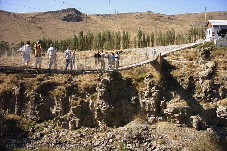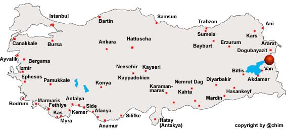 Der Wasserfall des Bendimahi Cayi bei Muradiye bietet ein eindrucksvolles Naturschauspiel. Durch eine tiefe Schlucht fließt der Bendimahi Richtung Van-See, in dem er in einem sumpfigen Delta mündet. Speziell dieses Delta scheint ein Eldorado für Ornithologen zu sein. An den Wasserfällen gelangt man über eine recht wacklige Hängebrücke zu einen kleinen Restaurant, von dessen Terrasse man den Wasserfall betrachten kann. An der Mündung des Bendimahi Çayi, am nordöstlichen Ufer des Vansees, liegt das Dorf Karahan. In Karahan wurden zwei Fels-Inschriften des urartäischen Herrschers Menua gefunden. Sie sind in assyrischer Keilschrift ausgeführt. Beide Inschriften sind beschädigt, von der zweiten ist nur die standardisierte Fluchformel erhalten. Die Inschrift berichtet vom Bau eines Turmtempels und einer Festung auf jungfräulichem Gelände ("nichts war hier gebaut"). Außerdem legte Menua Wingerte und Fruchtgärten an. Die Festung trug den Namen Arzuniuli. Außer dem Reichsgott Ḫaldi erwähnt die Inschrift auch den Gott Ua, vielleicht eine lokale Gottheit. Quelle: Wikipedia u.a. |