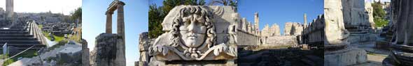 Im Gegensatz zu Milet oder Priene war Didyma keine Stadt, sondern eine dem Gott Apollon geweihte Kultstätte. Der Apollontempel war als bedeutendes Orakelheiligtum in seiner Größe nur von dem Artemision in Ephesus und dem Heraion in Ionien übertroffen. Heute zählt er zu den am besten erhaltenen Großbauten des Altertums. Ab dem 6. Jh. v. Chr. verband eine 18 km lange "Heilige" Straße, ein Prozessionsweg, das antike Milet mit dem Tempel. Herodot, der Vater der Geschichtsschreibung, berichtet, dass die Ionier um die Wende zum 1. Jahrtausend v.Chr. einwanderten und eine ältere Kultstätte übernahmen, an der in vor-griechischer Zeit eine weibliche Naturgottheit verehrt wurde. Dies war jedoch bisher archäologisch nicht nachweisbar. Der Legende zur Folge gebar Leto am Ort der Orakelstätte von Zeus ihren Sohn Apollon. Die Legende berichtet weiter, Apollon sei später einem einheimischen Hirten namens Branchos erschienen und habe diesem die Sehergabe verliehen. Auf diesen Hirten führte sich das karische Priestergeschlecht der Branchiden zurück, die bis in die Zeit der Perserkriege Namensgeber und Vorsteher des Heiligtums waren. Die Priester des Heiligtums wurden später auch in Milet eingesetzt und gehörten zu angesehenen Familien der Stadt. Das Orakel hatte wahrscheinlich schon im 7. Jahrhundert v. Chr. einen internationalen Ruf. Dies belegt zum einen Herodot, der von Weihgeschenken des ägyptischen Pharao Necho und des Lyderkönigs Kroisos berichtet, zum anderen der tatsächliche Fund zahlreicher Weihgeschenke. Herodot berichtet, dass der Perserkönig Dareios 494 v.Chr. nach dem Fall Milets den Tempel plündern und in Flammen aufgehen ließ. Andere Quellen berichten von einer Zerstörung im Jahr 479 v.Chr. durch den Perserkönig Xerxes. Archäologisch ist eine Brandzerstörung weder für 494 noch für 479 v. Chr. nachweisbar. Tatsache ist aber wohl, dass in den nächsten 150 Jahre keine neuen Baumaßnahmen stattfanden. Im letzten Drittel des 4. Jahrhunderts v. Chr. wurde das zuvor regionale Heiligtum Bestandteil der Stadt Milet. Milet gab den Auftrag zum Neubau des Apollontempels und setzte Jahresbeamte und Opferpriester ein. Der religiöse Betrieb des Orakels kam im Verlauf des 4. Jahrhunderts durch das Einsetzen des Christentums zum Erliegen. In der Spätantike war Didyma Bischofssitz und wurde durch Kaiser Justinian I. mit dem Titel Iustinianopolis geehrt, bevor der Ort im Frühmittelalter einen rapiden Niedergang erlebte. Vom 10. bis 12. Jahrhundert war Didyma erneut Sitz eines Bischofs. Zweimal, im 7. und im 15. Jahrhundert, zerstörten Erdbeben Didyma. Letzteres führte zur Aufgabe der Siedlung. Erst am Ende des 18. Jahrhunderts besiedelte man den Ort wieder. Der Ort wird seit dem 18. Jahrhundert erforscht. Zuerst durch englische, dann französische, schließlich durch zuletzt deutsche Archäologen. Dem zufolge finden sich Fundstücke aus Didyma im British Museum in London, im Louvre in Paris und im Pergamonmuseum in Berlin wieder. Quelle: Wikipedia |