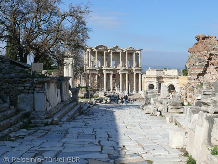 Ephesos liegt ca. 70 km südlich von Izmir, zwischen dem Urlaubsort Kuşadası und der Stadt Selçuk, der in 3 km Entfernung liegenden Nachfolgesiedlung der antiken Weltstadt Ephesos. Warnen möchten wir alle Individualreisenden vor den Schleppern auf dem großen Parkplatz am Theater, die Ihnen anbieten, sie für einen geringen Obolus ans andere Ende von Ephesos zu bringen, damit sie den Weg durch die Stadt nur einmal (und nur bergab) machen müssen. Willigen Sie ein, finden Sie sich garantiert zufällig, weil ja fast auf dem Weg, im Teppichladen des "Schwagers", "Bruders" o.ä. des netten Herrn wieder. |