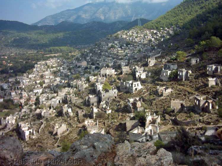 Die Geschichte des Dorfes Kayaköy soll bis auf 3000 v. Chr. zurückgehen. Auf dieser Zeit lassen sich erste Siedlungsspuren datieren. Man hat, meinen Quellen zur Folge, in unmittelbarer Nähe des Dorfes Sarkophage und Felsengräber aus dem 4. Jahrhundert v. Chr. gefunden. Der in der letzten Periode des osmanischen Reiches wiederbesiedelte Ort wurde im Jahre 1923 aufgrund des Völkeraustausches von den dort ansässigen griechischen Bewohnern verlassen und sind seither dem allmählichen Verfall preisgegeben. Im Laufe der Zeit wurden die Dächer durch die Einwirkungen der Natur beschädigt und stürzten ein. Nur die Kirchen haben etwas besser durchgehalten. Manche Fresken sind nahezu unversehrt. In dem verlassenen Dorf befinden sich etwa 350 bis 400 Häuser, nicht größer als 50 qm. Sie sind so gebaut, dass keines dem anderen Licht oder Aussicht nimmt. Die unteren Stockwerke wurden als Keller benutzt. Hier befanden sich auch die Zisternen, in denen das Regenwasser der Dächer gesammelt wurde. Touristen aus aller Welt brachten neues Leben in die Ruinen. Die unvermeidlichen Verkaufsstände und Kebap-Stände sind inzwischen auch hier zu finden. Es gibt Pläne, als Symbol der türkisch-griechischen Freundschaft, einen Teil von Kayaköy mit Hilfe der Europäischen Gemeinschaft wieder aufzubauen. Man stellt sich vor, Kayaköy könnte ein Künstlerdorf werden. |