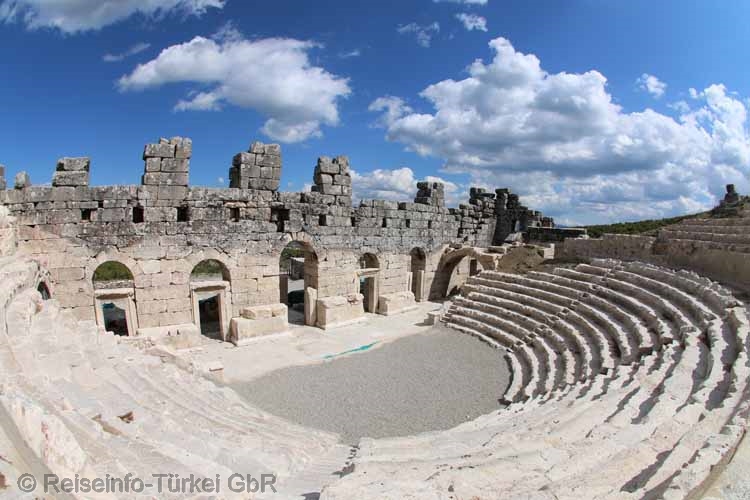 Stadion. Betritt man das Gebiet der antiken Stadt Kibyra, stößt man zuerst auf das einst etwa 12.000 - 13.000 Zuschauer fassende, etwa 200 m lange Stadion. Die die Sitzreihen tragende Stützmauer auf der Westseite ist nicht erhalten. Zeichnerische Rekonstruktionen aufgrund der architektonischen Funde lassen die einstige Pracht dieses Bauwerkes erahnen. An der offenen Seite des hufeisenförmigen Stadions befand sich ein 7 m hohes, monumentales Tor mit fünf Rundbögen. Oberhalb der heute noch bestehenden Sitzreihen war über die gesamte Länge des Stadions ein mit unzähligen Rundbögen versehener Portikus errichtet. Ein weiteres architektonisches Kleinod ist die unterhalb der höher gelegenen Agora erhaltene Terrassenstraße, die mit einer Stoa versehen war. Am südlichen Ende der Terrassenstraße endete die vom Stadion kommende Hauptstraße. Dort befindet sich ein aufwendig mit fein gearbeiteten Fresken verziertes Prunktor. An der Größe des Theaters von Kibyra kann man die einstige Größe der Stadt erahnen. Es ist in drei Zuschauerränge unterteilt und hatte ein Fassungsvermögen von etwa 8.000 Plätzen. Das ursprünglich griechische Theater wurde in römischer Zeit mit einem steinernen Bühnenhaus versehen. Auf der Rückwand des oberen Diazoma sind etliche Ehreninschriften erhalten. Der heute sichtbare Teil des Bühnenhauses bildet bereits das 2. Stückwerk. Der untere Teil ist noch unter Schutt und Sedimenten verborgen. Ein
