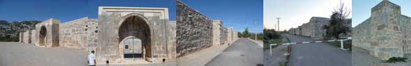 Kirkgöz Han ist eine alte seldschukische Karawanserei, ca. 35 km von der Altstadt Antalya entfernt. Gemäß einer sechszeiligen Inschriftentafel über dem Eingangsportal wurde der exakt nach Norden ausgerichtete Han in den Jahren 1237 - 1246 unter Sultan Giyaseddin Keyhüsrev II erbaut. Seine Größe beträgt 33 x 52 Meter. Der Grundriss dieser Karawanserei, die dritte Giyaseddins, ähnelt der Evdir Han, die sein Vetter, Sultan Izzeddin Keykavus I, in den Jahren 1215 - 1219 errichtet hatte, weist aber einen wesentlichen Unterschied auf. Kirkgöz Han wurde im Jahre 2008 komplett renoviert und instandgesetzt. Leider ist er seither für Fremde nicht mehr zugänglich. Das Innere kann man lediglich durch das mit Plexiglas verkleidete Eingangstor erahnen. |