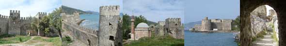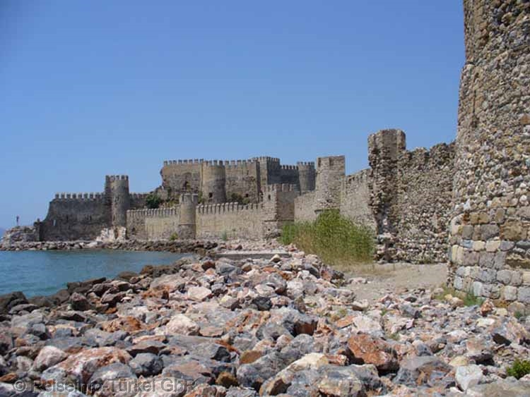 Das Mamure Kalesi bei Anamur ist eine der ältesten und besterhaltenen Befestigungsanlagen an der türkischen Südküste. Die Ursprünge der Burg reichen bis ins 3. Jh. n. Chr. zurück. Die Römer erbauten an dieser Stelle eine Wehranlage. Die Byzantiner übernahmen später die Burg während kleinarmenische Fürsten sie im 12. Jh. zum Schutz vor Piraten zu ihrem heutigen Aussehen ausbauten. Den Kreuzfahrern diente sie als Quartier und Nachschublager. Im 14. Jahrhundert kam die Burg in den Besitz der Emire von Karaman und ging ab der zweiten Hälfte des 15. Jahrhunderts an die Osmanen, die die Festung im 18. Jahrhundert renovierten. Die Moschee im Innenhof wurde 1840 errichtet. Da die Anlage nie als Sitz eines Herrschers diente, ist sie als rein strategischer Zweckbau konzipiert. Das von den Burgmauern eingefasste Areal ist in drei Höfe unterteilt, die durch starke Mauern voneinander getrennt sind. 36 Türme und zinnenbewährte Umläufe boten den Verteidigern Schutz. Von der Landseite war die Burg durch einen Wassergraben geschützt, der heute von Massen an Schildkröten bewohnt ist. |