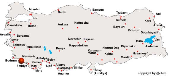 Das genaue Gründungsdatum von Marmaris ist nicht bekannt. Erste Quellen stammen aus dem 6. Jahrhundert v.Chr. und nennen die Stadt bei ihrem antiken Namen Physkos. Die erste Ansiedlung geht auf die Karer zurück. Die Karer kamen nach den Schriften des Historikers Herodot von Kreta. Sie siedelten sich hier im Gebiet der heutigen Provinz Mugla an und nutzten den natürlichen Hafen als Marinebasis für ihre Überfälle auf die Phönizier auf Rhodos und die anderen Inseln im Ägäischen Meer. Im Jahre 138 v. Chr. trat Attalos III., König von Pergamon (Bergama), Physkos an Rom ab. Die Stadt unterstand fortan den römischen Generälen auf Rhodos. 1425 wurde die Stadt vom Osmanischen Reich vereinnahmt. Danach wurde die Burg 1522 für einen geplanten Rhodos-Feldzug gebaut. Nach einer örtlichen Legende bedeutet der Name der Stadt "Vier erhängte Architekten". Er rührt aus der Entstehungsgeschichte der prägenden Burg her. Der damalige Sultan Süleyman der Prächtige befahl 1522, nach seinem Sieg über Rhodos, seinen vier Architekten, eine Burg zu bauen, die man selbst noch in Rhodos sehen könnte. Heraus kam eine relativ kleine Burg, was den Sultan dermaßen erboste, dass er bei der Rückkehr von einer Expedition nach Rhodos beim Anblick des Kastells "Mimar äs!" ausgerufen haben soll, was soviel heißt wie "hängt die Architekten auf"! Es gibt hierfür aber keine verbriefte Quelle. Im Jahre 1958 wurde Marmaris durch ein Erdbeben fast völlig zerstört. Als eines der wenigen historischen Gebäude wurde die Festungsanlage Marmaris Kalesi kaum beschädigt. Um das mittelalterliche Kastell gruppieren sich in engen Gassen die Fachwerkhäuser der Altstadt. Diese stehen alle unter Denkmalschutz. Im Jahr 2009 war Marmaris ein Zielort der Presidental Tour of Turkey. Marmaris liegt an der Türkischen Ägäis auf der Halbinsel Bozburun. Im Norden der Stadt befindet sich der Golf von Gökova, im Süden das Mittelmeer. Westlich des Ortes liegt die Datça-Halbinsel. Im Osten liegt der Bezirk Köyceğiz mit dem gleichnamigen See. In der weiteren Umgebung liegen Touristenzentren wie z. B. Bodrum oder Fethiye. 8 km westlich von Marmaris liegt Icmeler, ursprünglich ein kleiner Ort, der sich im Laufe der letzten 20 Jahre zu einer Bettenburg entwickelte. Die gesamte Strandlinie ist mit Hotels bebaut, vom 5-Sterne-Hotel bis zur familiären Unterkunft. Ein ideales Gebiet für Wanderer und Biker. Es gibt eine Bootsverbindung nach Turunc und gute Verkehrsverbindung nach Marmaris mit dem Dolmuş. Aufgrund seiner Lage in der Ägäis, an der so genannten „Türkischen Ägäis“, ist Marmaris ein bedeutsames Touristenziel. Die Stadt liegt an einer großen, geschützten Bucht, die als natürlicher Hafen für die Berufs- und Freizeitschifffahrt dient. Im Verkehrshafen legen u.a. große Kreuzfahrtschiffe wie die AIDA Cruises-Flotte und die Schiffe der Carnival Cruise Lines an. Es gibt zwei große und mehrere kleine Marinas. Hunderte von Skippern überwintern hier jährlich. Der Yachthafen ist mit über 600 Liegeplätzen der größte in der türkischen Ägäis. Von Marmaris verkehren Fähren zur griechischen Insel Rhodos, die bei gutem Wetter in Sichtweite liegt. Quelle: Wikipedia |