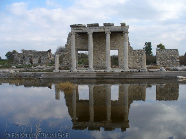 Die beste Zeit Milet zu besichtigen ist der Herbst. Im Frühjahr steht der Grundwasserspiegel wie überall im Schwemmland des großem Mäander sehr hoch, sodass z.B. im Frühjahr Vieles, wie auf dem obigen Foto, unter Wasser steht. |